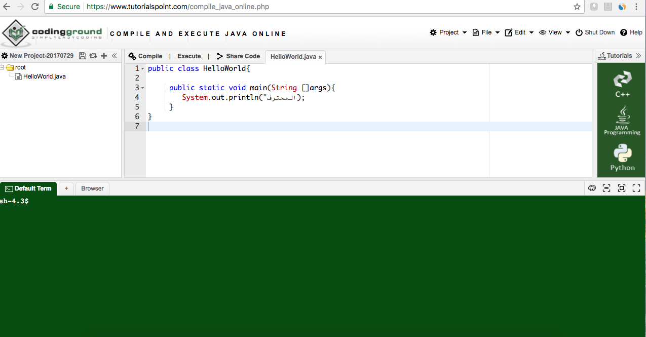 الموقع لا يحتاج لشرح كل ما عليك هو البحث عن اللغة التي ترغب في التعلم لها أو أن تختبر بعض الأكواد .. ، و تقوم بالضغط عليها مباشرة سينقلك إلى الصفحة الخاصة بكتابة الأكواد فعلى سبيل المثال ، أنا سأختار في هذه التدوينة ، لغة الجا?ا ( الصورة التي أسفل هذه التدوينة تبين لك الواجهة الخاصة بتجربة الأكواد )