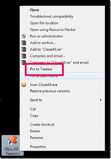 اولا بعد تحميل تطبيق Close All Windows قم بفك الضغط عنه ويستحسن ان تقوم بهذه العملية في مسار آخر غير سطح المكتب مثل ملفاتك الشخصية على ىلويندوز ، بعد ذلك قم بإنشاء مختصر للتطبيق على سطح المكتب من خلال النقر بزر الفأرة الايمن على ايقونة التطبيق تم انقر مرة اخرى على send to بعد ذلك إختر desktop كما هو مبين في الصورة بعد ذلك توجه إلى الايقونة المختصرة للتطبيق على سطح المكتب ،انقر عليها مرة اخرى بزر الفأرة الايمن واختر pin to taskbar لكي تضهر على شريط المهام . هكذا في كل مرة رغبت في إغلاق جميع البرامج قم بالنقر على الايقونة وسيتغلق كافة البرامج دفعة واحدة .