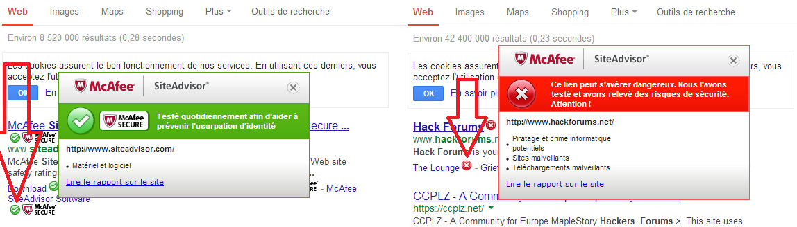 فاللون الاخضر يعني ان الموقع يمكنك تصفحه ، في حين اللون الاصفر يعني ان الموقع مشكوك فيه ، اما اللون الاحمر يعني انه يجب عليك الإبتعاد عن ذلك الموقعو يمنعك حتى من زيارة الموقع إن أقتضى الحال.