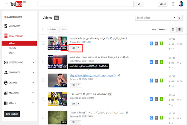أولا و لنكون واضحين فمن أجل زيادة أرباح فيديوهاتك على اليوتيوب يجب ان يكون ذلك الفيديو يتجاوز 10 دقائق عندها تستطيع التعديل عليه بخصوص ضهور الاعلانات و مجموعة من الأمور ، أولا تقوم بالنقر على 'My Channel' ثم بعد ذلك 'Video Manager' و تقف عند الفيديو الذي تتجاوز مدته 10 دقائق أنذاك تنقر على 'Edit'.