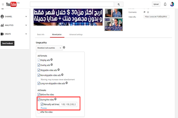 بعد ذلك ستتوجه الى الاعدادات التي ستجدها أسفل الفيديو و تنقر على قسم 'Monetization' و تقوم بتفعيل خيار 'During the video' بعد ذلك تجعل علامة صح على 'Manually set times' و تقوم باداخل هذا الكود في الخانة المخصصة لذلك ' 1:00,1:50,2:00,2:50,3:00,3:50,4:00,4:50,5:00,5:50, 6:00,6:50,7:00,7:00,8:00,8:50,9:00,9:50,10:00 '