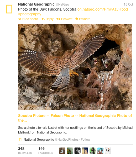 ومثال آخر من حساب قناة ناشيونال جيوغرافيك الرسمي حيث تظهر التغريدة الموسعة عندما تنشر فيها القناة رابطاً من الموقع لصورة ما، فظهر الصورة مباشرة ضمن التغريدة الموسعة وبحجم كبير و وصف عنها وحتى عنوانها.