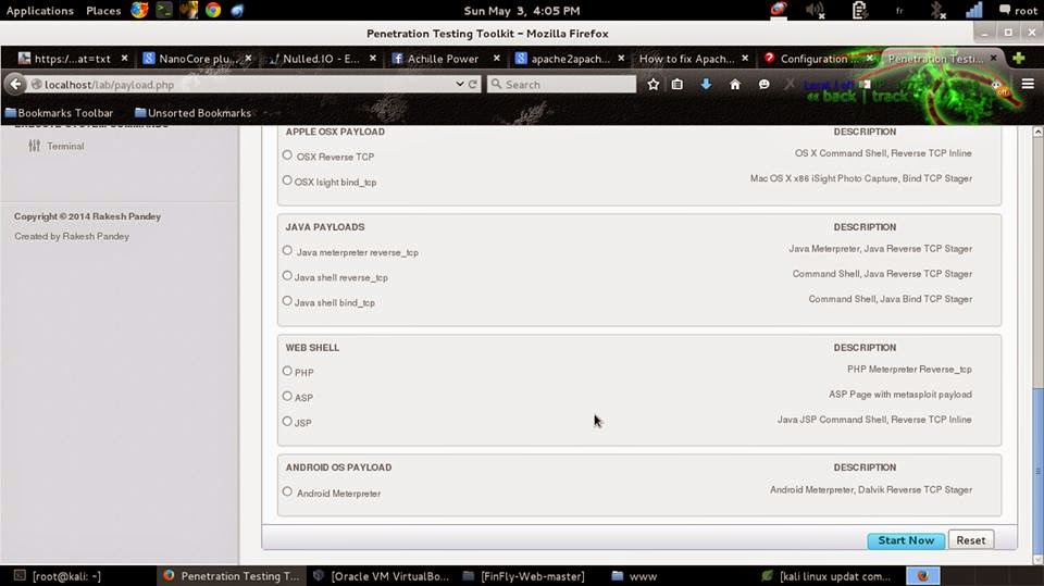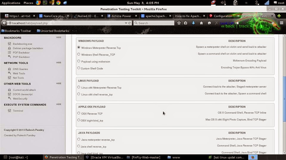 1)Payload Generator - Quick Payload,Windows payload- Linux Payload - Apple OSX Payload - Java Payloads - Web Shell - Android OS Payload .