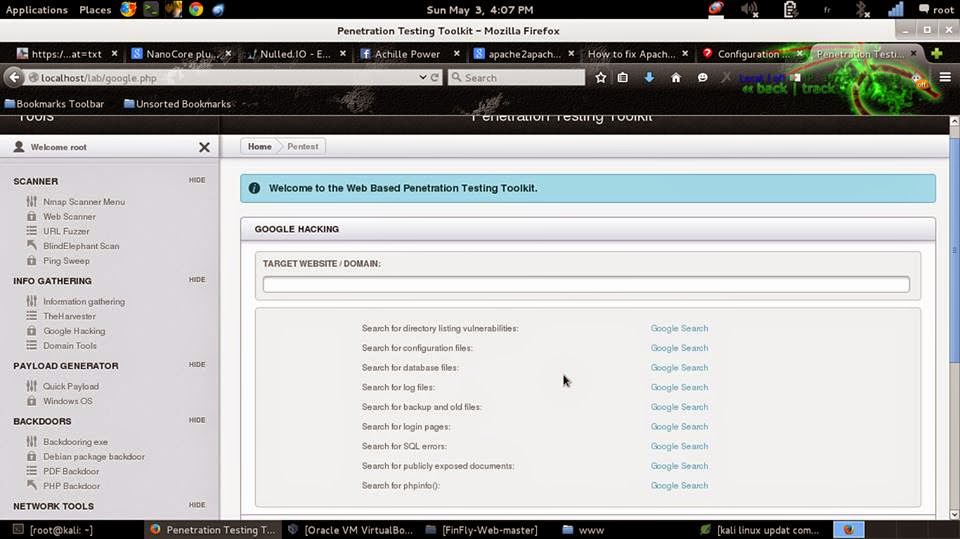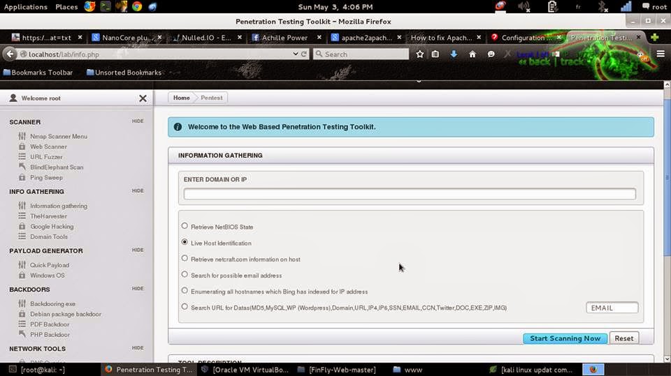 * Includes web interface for different tools for web scanning like nmap,uniscan,lbd,wapiti,nikto,whatweb,sslyze etc