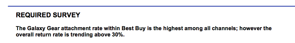 أعلنت شركة (Best Buy) الأمريكية التي تملك محلات في الولايات المتحدة و كندا لبيع الأجهزة الإلكترونية من خلال مذكرة موجهة إلى إدارة شركة سامسونغ الكورية أن 30 في المئة من مبيعات الساعة الذكية لسامسونغ (Galaxy Gear) تم إرجاعها للمحل بسبب عدم رضى الزبناء عن أدائها. المذكرة التي حصل عليها موقع (Geek.com) وقام بنشرها والتي أرسلتها شركة Best Buy لشركة سامسونغ تبين بالملموس عدم رضى نسبة كبيرة من الزبائن الأمريكين عن أداء الساعة الذكية الجديدة Galaxy Gear, ويرجع ذالك بالأساس إلى التطابق المحدود بينها وبين باقي الأجهزة الذكية لسامسونغ حيت أنه إلى وقت جد قريب كانت الساعة تعمل بتطابق فقط مع Galaxy Note 3 و galaxy note 10.1 وهو الأمر التي تداركته سامسونغ بالإعلان عن تحديث 4.3 لأندرويد والذي سيسمح بمطابقة الساعة مع أجهزة سامسونغ ( Galaxy S4, S3 و Note 2) بالإضافة إلى التصميم العام للساعة الذي مازال غير مقنعا لعدد كبير من الناس بالإضافة إلى الثمن الذي إعتبر مرتفعا بالمقارنة مع مميزات Galaxy Gear الجديدة.