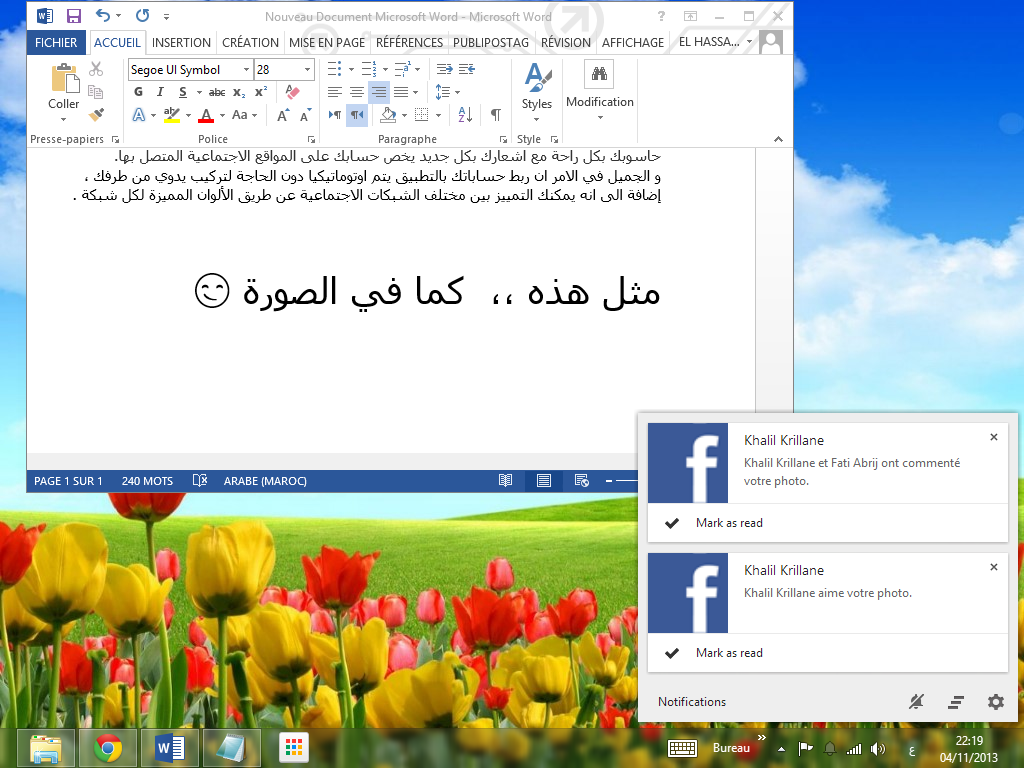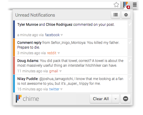الكل منا يقضي ساعات طويلة أمام شاشةعليها حساباته بالمواقع الاجتماعية ، الأمر الذي قد يصبح خطيرا جدا على البعض، فهناك حالات كثيرة وصل بها الامر لدرجة الإدمان على الشبكات الاجتماعية و أماالعواقب فحدث ولا حرج ، ومن الأسباب التي تجعل الشخص يقضي وقت طويل معتكفا هوالحصول على التحديثات الجديدة ، الامر الذي يلهي البعض عن زيارة مواقع مفيدة و التيقد تساعده في تطوير ذاته و مهاراته و معارفه عبر الانترنت . و الجميل في الامر ان ربط حساباتك بالتطبيق يتم اوتوماتيكيا دون الحاجةلتركيب يدوي أو تدخل منك، إضافة الى انه يمكنك التمييز بين مختلف الشبكاتالاجتماعية عن طريق الأيقونات المميزة لكل شبكة ، و انتقال سريع الى هذه الإشعاراتبضغطة زر واحدة ، و نفس الأمر بالنسبة لإشعارات المتصفح .![]() فالحصول على اشعارات الشبكات الاجتماعية أمر جميل جدا سيغنيك عن قضاء فترات زمنيةمعينة في انتظار تحديثات جديدة . فعلى مدى عدة شهور قام المطورون بالعمل على مجموعة من البرامج على شكل امتدادلمتصفح غوغل كروم ، لكن المشكلة في هذه الإضافات هي أن كل واحدة توفر لك تحديثاتشبكة اجتماعية معينة . و كما عودكم طاقم مدونة المحترف في جعل حياتكم المعلوماتية أكثر سلاسة و جمال، و علىغرار ذلك أقدم لك إضافة Chime و التي تسمح لك تقريبا بالحصول على تحديثاتالمواقع الاجتماعية كافة (فايسبوك ، تويتر ، غوغل بلس ، لينكدن .....) الجميل في الإضافة ان التحديثات تتوفر أعلى متصفح غوغل كروم حيث يمكن الوصول اليها بسهولة بالغة كما فيالصورة أدناه . ليس هذا فقط بل هناك خاصية الاشعار لسطح المكتب الأكثر من رائعة ، حيث بإمكانكالعمل في حاسوبك بكل راحة مع اشعارك بكل جديد يخص حسابك على المواقع الاجتماعيةالمتصل بها كما في الصورة الأولى أعلاه. هذا كل ما في الموضوع أتمنى أن ينال إعجابك ، مع تمنياتي لك بتقليل المدد الزمنية التي تقضيها أمام الشبكات الاجتماعية و تعويضها بشيء مفيد لحاضرك و مستقبلك . إضافة Chime