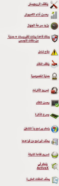 من مميزات هذا البرنامج انة ينظف الريجستير ويحسن اداء الكمبيوتر ويعمل على زيادة سرعة الكمبيوتر كما انة برنامج قوى للدفاع الشامل وينظف النظام من اخطاءة كما انة يعمل على تسريع النت وتنظيف الذاكرة ومميزات عديدة اخرى