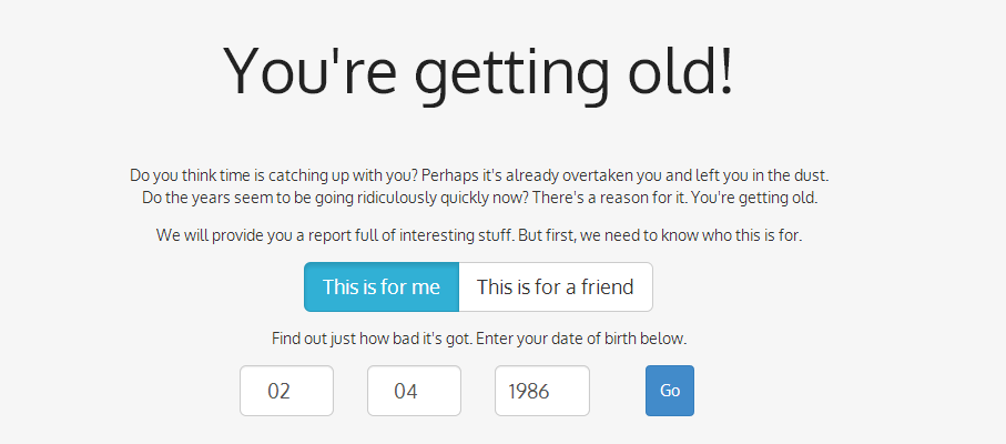 !You're getting old هو موقع اكثر من رائع يتيح لك معرفة تفاصيل عن حياتك انت بنفسك لاتعرفها مند ولادتك وإلى حدود الساعة ، كمثلا ان تعرف كم نبضة نبضها قلبك مند ولادتك وإلى حدود الدقيقة التي دخلت فيها الموقع ، او كذلك معرفة كم عملية شهيق وزفير قمت بها ،بالإضافة إلى كم خطوة قمت بها على الارض مند ولادتك، ومن هم مشاهير العالم الذين إزدادوا في نفس تاريخ إزديادك وبعض الاحداث العالمية التي رافقت ولاداتك ... الخ من المعلومات التي حتما لم تكن تعرفها عنك ! بعد ولوجك لموقع ! You're getting old من الرابط اسفل التدوينة سيطلب منك إدخال تاريخ إزديادك حسب اليوم والشهر والسنة ، فلاتتردد . بعد ذلك ستتنقل إلى صفحة بها جميع المعلومات عنك . ففي اول الصفحة ستجد بالضبط كم سنك بعدد السنوات ، الاشهر وكذلك الايام كما ستجد اسفل هذه المعلومات معلومات اخرى مثلا حول كم نبضة نبضها قلبك واسفلها كم عدد المرات التي تنفست فيها ، وكم دورة قام بها القمر على الارض مند ولادتك وكم هوترتيبك بالنسبة لعدد الناس التي تعيش على الارض .... وغير ذلك من المعلومات الغريبة والممتعة . فلا تتردد في طرح رأيك حول الموقع في تعليق ! موقع : ! You're getting old