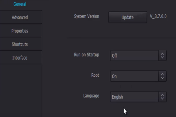 و الأن كل ما عليك هو تشغيل البرنامج و تقوم بإعداده حيث ستجد أيقونة الإعدادات قم بالنقر عليها و فعل خاصية الروت و كذلك إختر اللغة و سيكون أحسن إن إخترت اللغة الإنجليزية من قائمة General كما هو مبين في الصورة التالية :